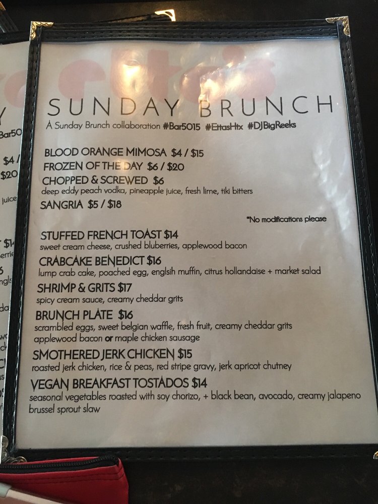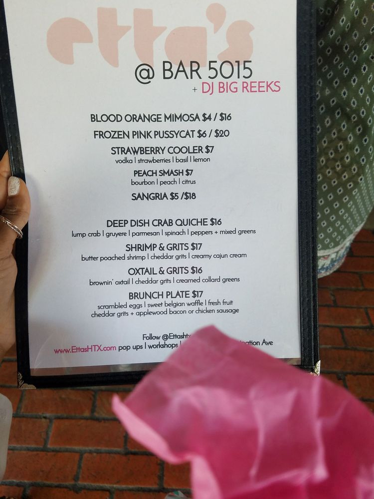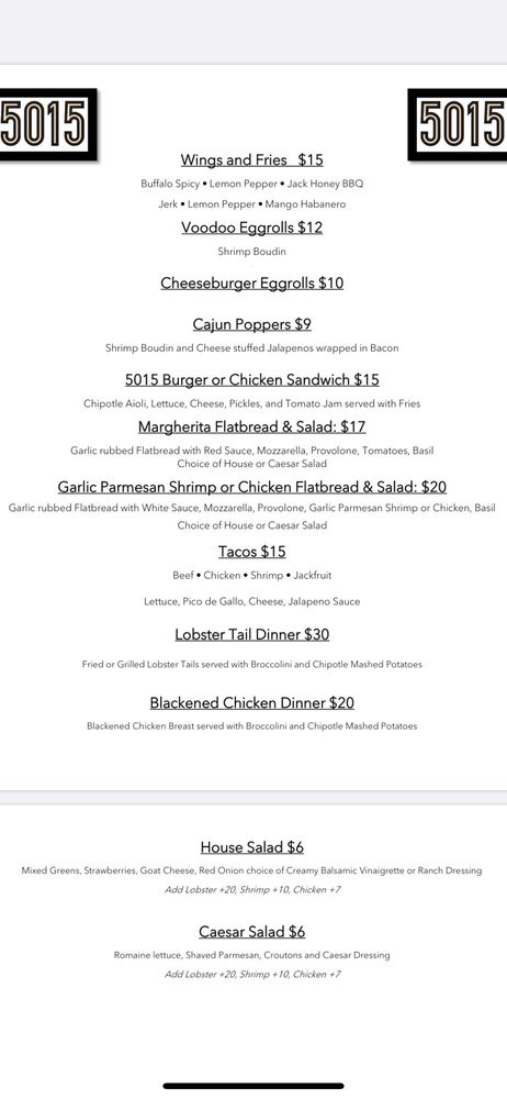Bar 5015 is a vibrant American bar located in Houston, TX, offering a range of exciting features such as live music, outdoor seating, and a full bar. The menu boasts unique dishes like Cheeseburger Eggrolls and Voodoo Eggrolls, as well as Catfish and Wings Baskets. With options like the Chopped & Screwed Sandwich and Slutty Burger, the burger and sandwich selection is diverse and flavorful. Customer reviews praise the lively atmosphere, quick service, and delicious drinks. Bar 5015 seems to be a perfect spot for Sunday Funday activities, offering a great mix of food, drinks, and entertainment. Don't miss out on the opportunity to experience this trendy hotspot with its exceptional menu offerings and energetic vibe.